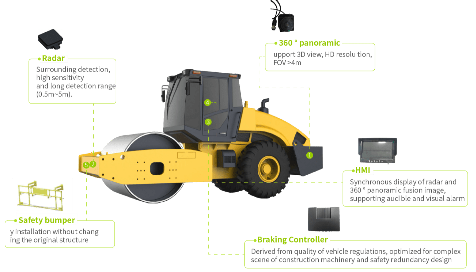 智能防撞系统(ICAS, Intelligent Collision Avoidance System),通过视觉与雷达传感器实现对工程机械四周的的人员、机械 、设备、车辆、及其他障碍物进行感知探测,并依据潜在碰撞风险 等级进行分级预警及主动制动